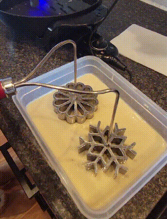 3. Immerse again in hot oil, covering completely. Remove from oil when bubbling subsides and pastry is golden brown. Use a fork to gently pull the rosette from the iron. Cool and sprinkle with granulated or powdered sugar.”
